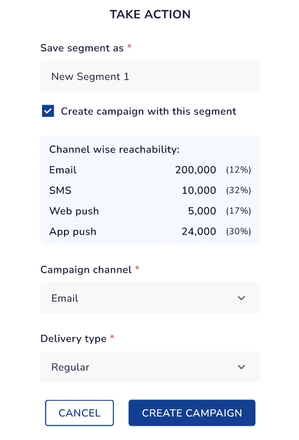 - Reachability insight: Know channel-wise reachability before sending the campaign.