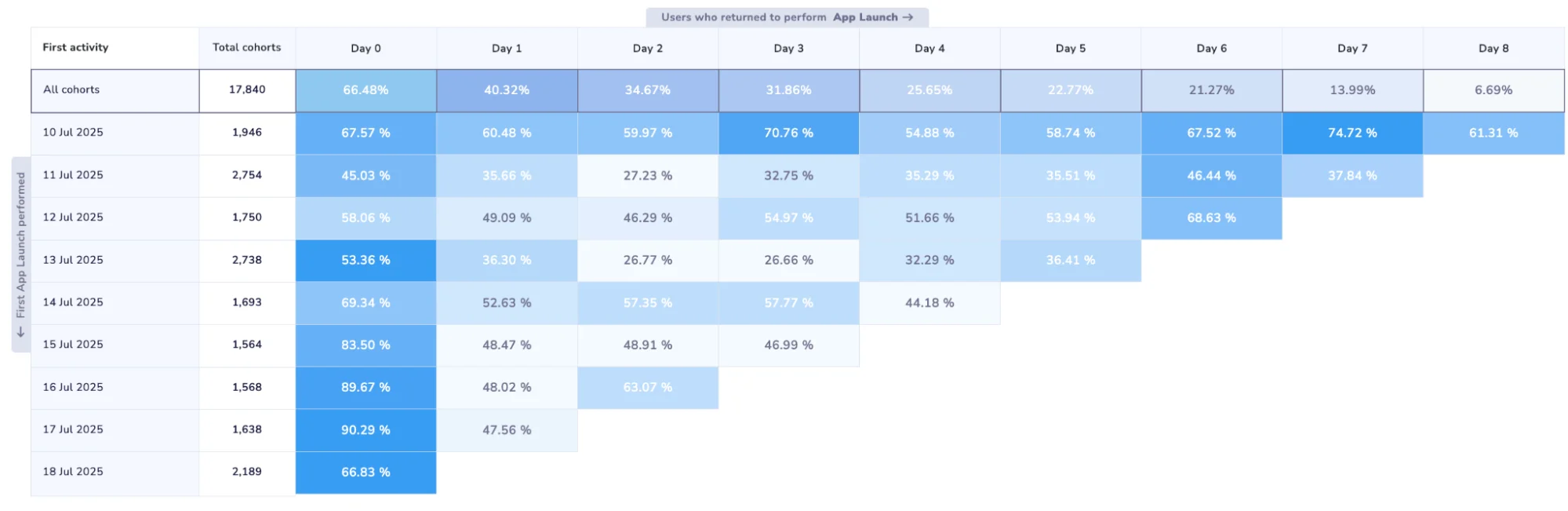 Retention isn’t one-size-fits-all. A 20% Day 7 retention rate looks very different if you analyze it by device type, app version, or geography.