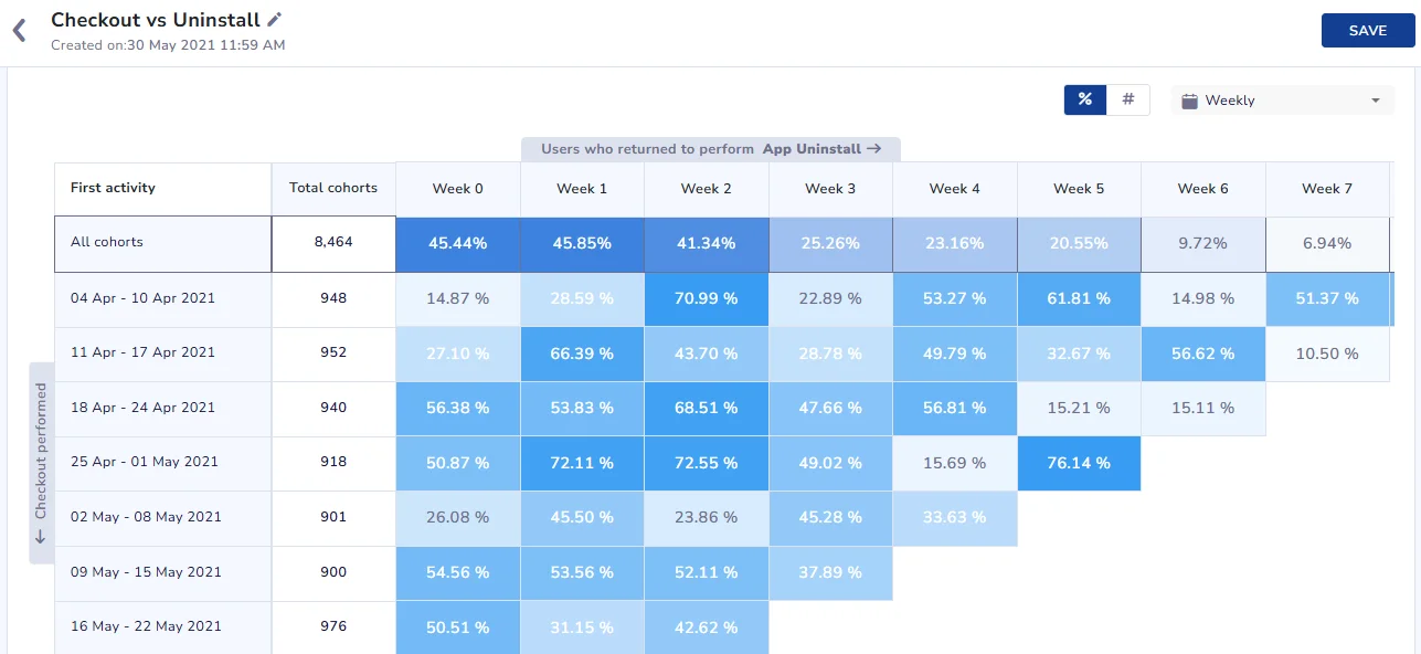 Benefit in action: An ecommerce app sees week 2 repurchases are dropping for younger age groups. Instead of exporting data, instantly create a campaign to address this issue from the Cohorts screen itself to send targeted campaigns before they forget about your brand.