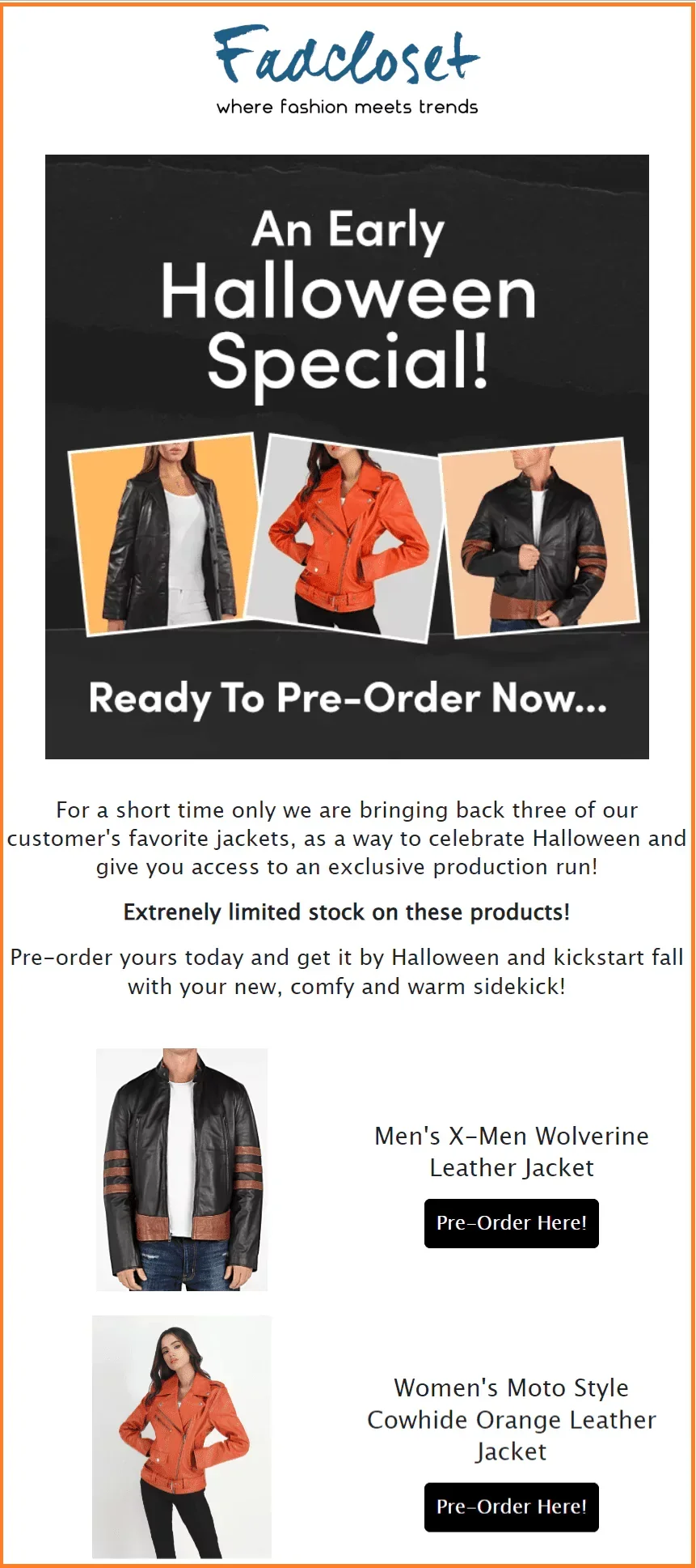 By leveraging pre-order sales, Fadcloset not only effectively forecasted demand for Halloween but also optimized inventory allocation for its limited-stock products. Their strategic move of incorporating pre-order emails ensured a successful By leveraging pre-order sales, Fadcloset not only effectively forecasted demand for Halloween but also optimized inventory allocation for its limited-stock products. Their strategic move of incorporating pre-order emails ensured a successful Halloween promotion, meeting customer expectations while minimizing overstock risks.