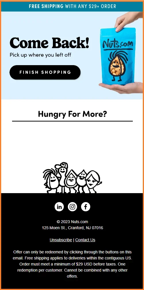 Nuts.com cleverly tapped into Halloween humor with their engaging browse abandonment email, featuring the pun-filled subject line “Don’t Ghost Us 👻.” This playful approach not only aligned with the holiday spirit but also encouraged customers to return and complete their purchases.