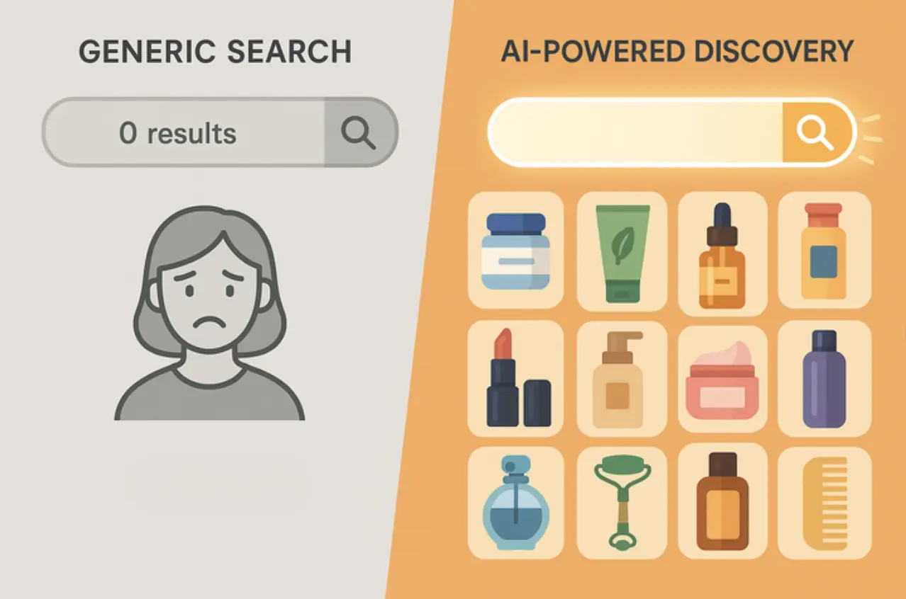 - Evolving shopper vocabulary. Customers now search for “glass-skin glow,” “rose-citrus scent,” or “matte but hydrating.” These phrases float outside rigid taxonomies, so the hero serum marketed as “brightening drops” may never appear when a shopper types “glow drops.”