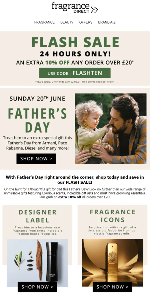 Conveying a sense of urgency in your email campaign can significantly boost conversions. Fragrance Direct’s email does this by announcing a “Flash Sale — 24 Hours Only!” This lets viewers know time is running out. The brand also reminds customers of the date of Father’s Day, shares some custom gift suggestions to surprise dad, and offers an extra discount as a cherry on top. If you want to push customers to make a purchase, this CTA-driven, FOMO-inducing email is a sure way to achieve this. Additionally, notice how the email places CTAs in the right spot, directly under each gift suggestion.