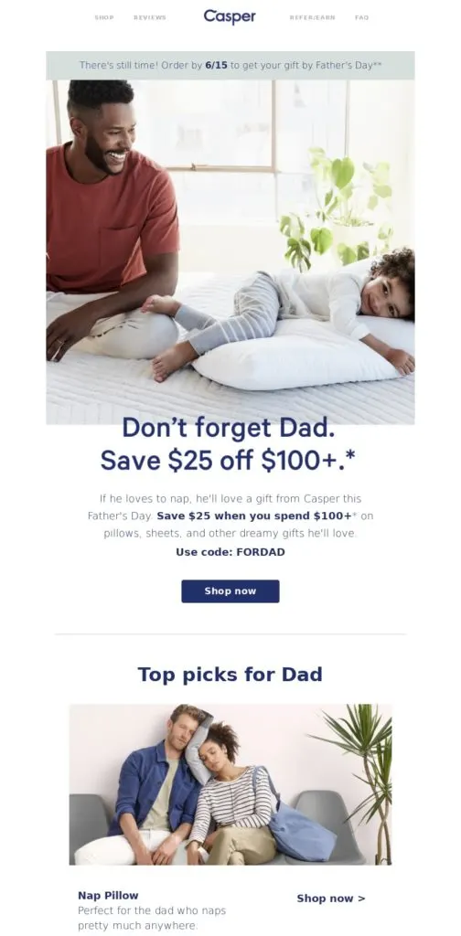 Personalization is a proven way to increase conversions and demonstrate your subscribers’ care and attention. Casper’s personalized Father’s Day email campaign features a curated shopping list of top picks anyone’s dad will appreciate. It also features a powerful tagline — Don’t Forget Dad — to grab customer attention. The campaign includes a special $25 discount and a sweet coupon code (FORDAD) as the ultimate cherry on top.