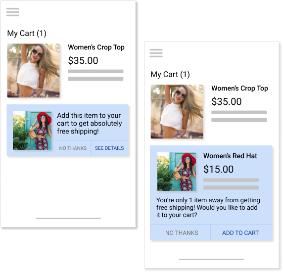 The highest moment of buying intent in the entire user journey, across the spectrum of business types, occurs on the cart page. Capitalize on this intent by deploying a display nudge with additional products that pair well with the cart items